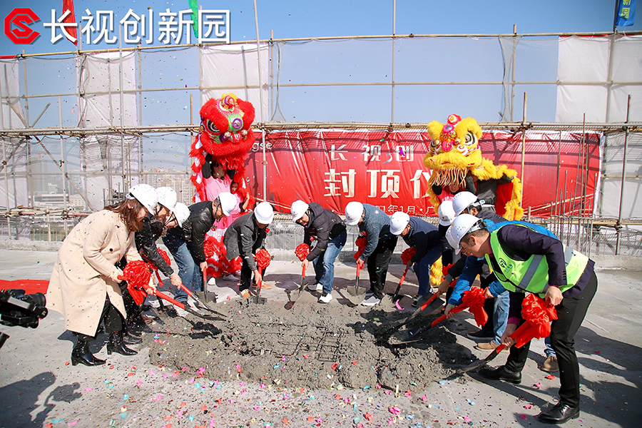 儀式最后一環(huán),各領(lǐng)導(dǎo)和來賓移步到樓頂用鐵鍬封頂,意味著長視創(chuàng)新園封頂儀式圓滿結(jié)束。